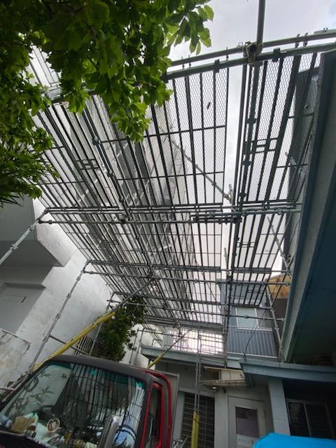 アーケード型の棚足場を設置してからの組立てでした。
