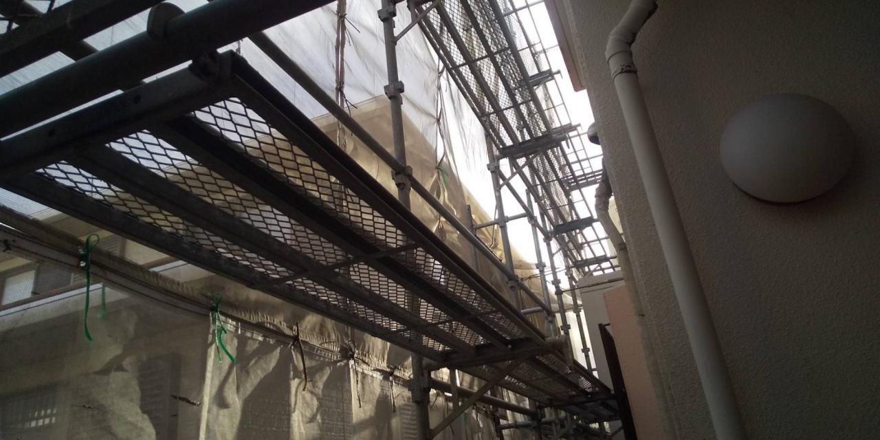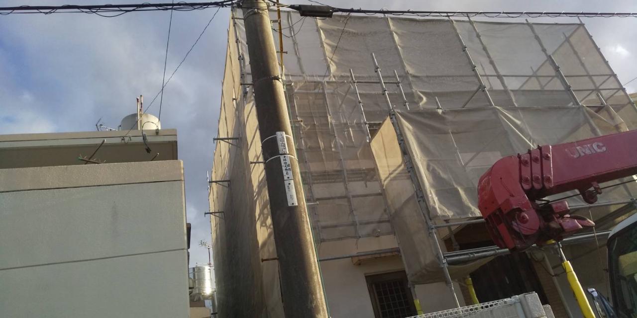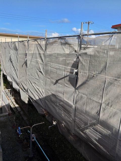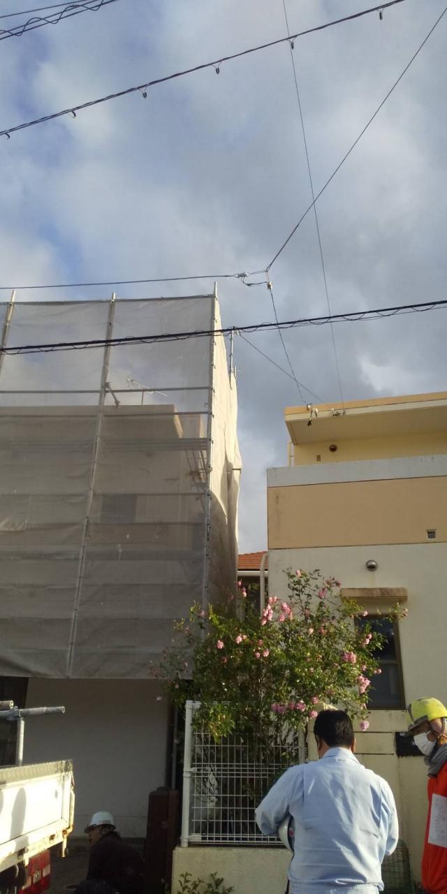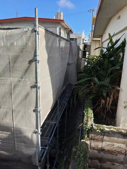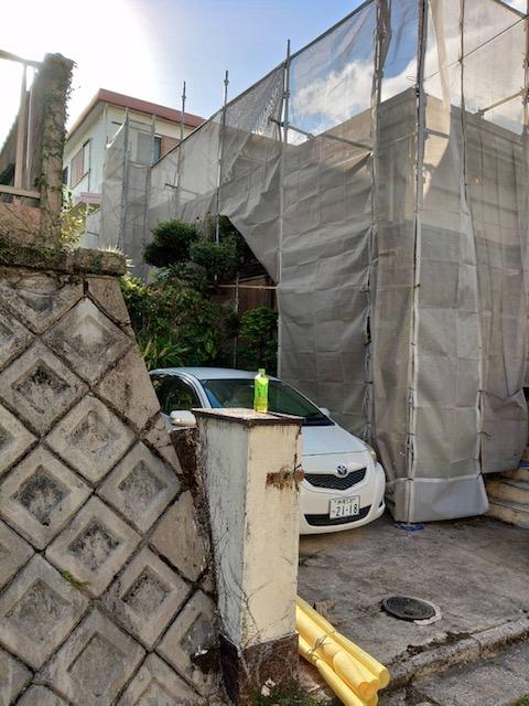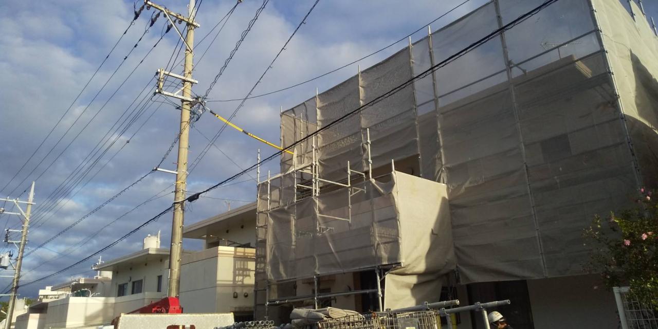 今回は、西原町にて外壁塗装工事に伴う足場を