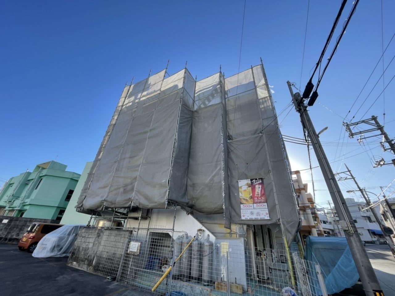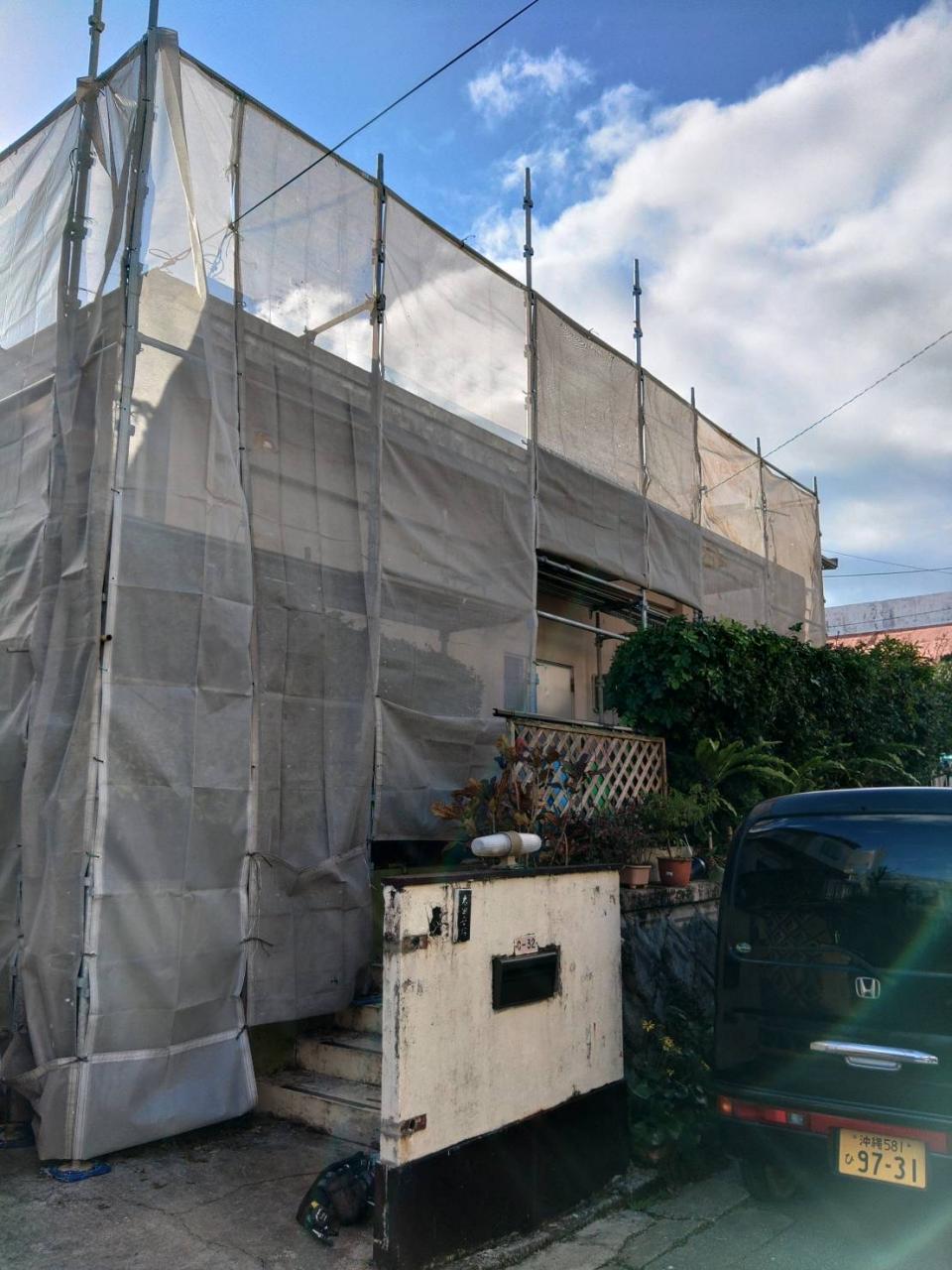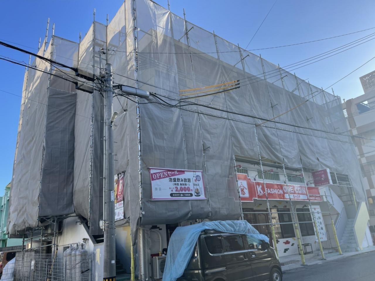 本日は、浦添市にて外壁塗装工事用の足場を